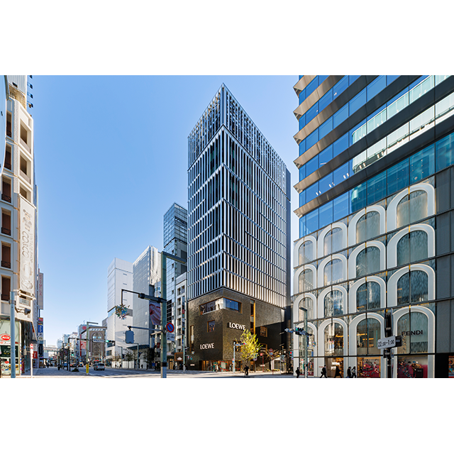 東京メトロ銀座線「銀座」駅より徒歩1分。銀座5丁目の中央通りに面した角地にある当社の東京のフラッグシップビルです。