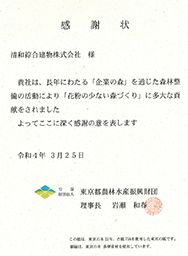 毎年1回社員による下刈り・植替え等を実施し、東京都より「とうきょう森づくり貢献認定制度 貢献認定書」を授与、当該期間のCO₂吸収量38.79tと認定されました。